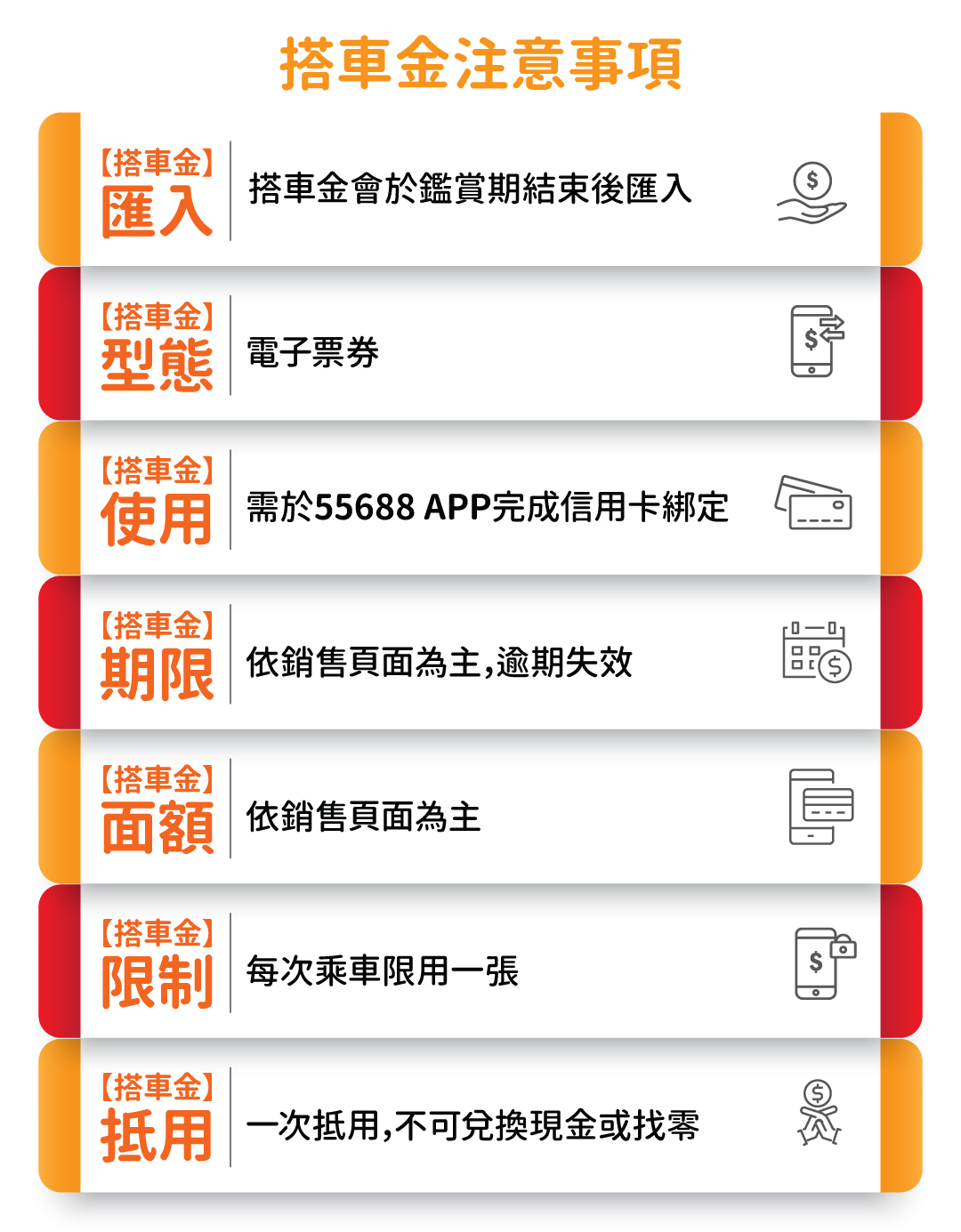 ˙ 贈搭車金共100元9張+74元1張 (使用期限180天)