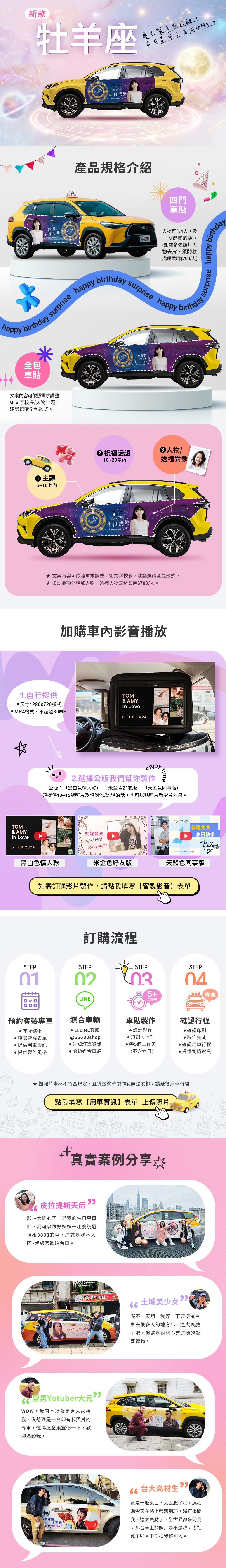 •照片收件時間:車貼製作需5個工作天,照片素材需於用車日5個工作天前提供 。若逾時提供,將無法安排印刷+張貼施工,訂單將不成立與退款或延後預約用車時間。