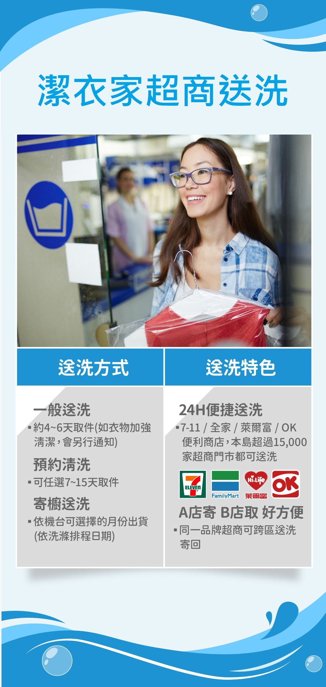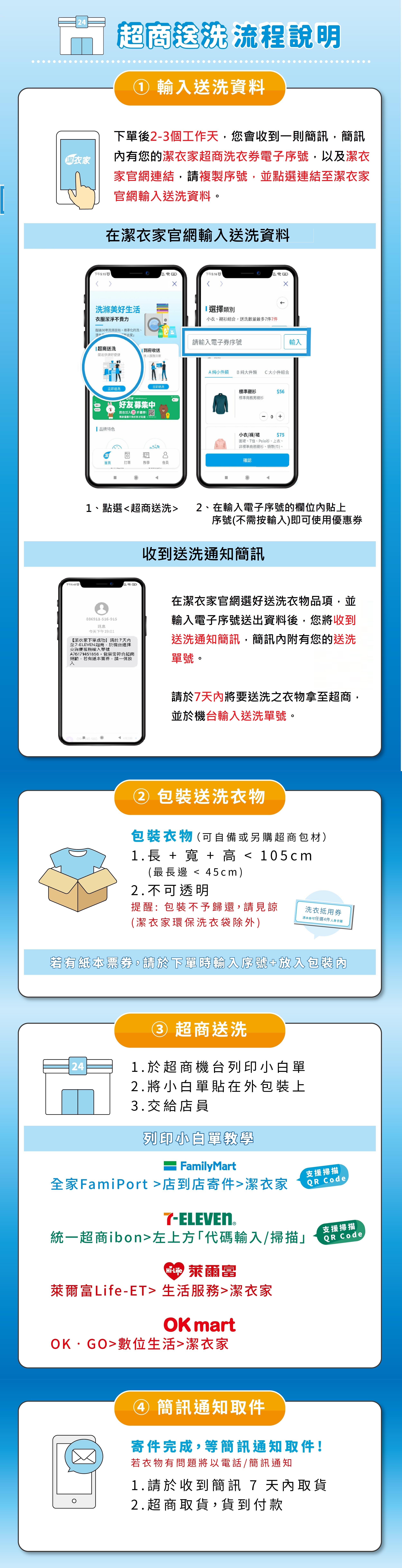 ˙ 4大超商皆可送洗,24H送洗最便利