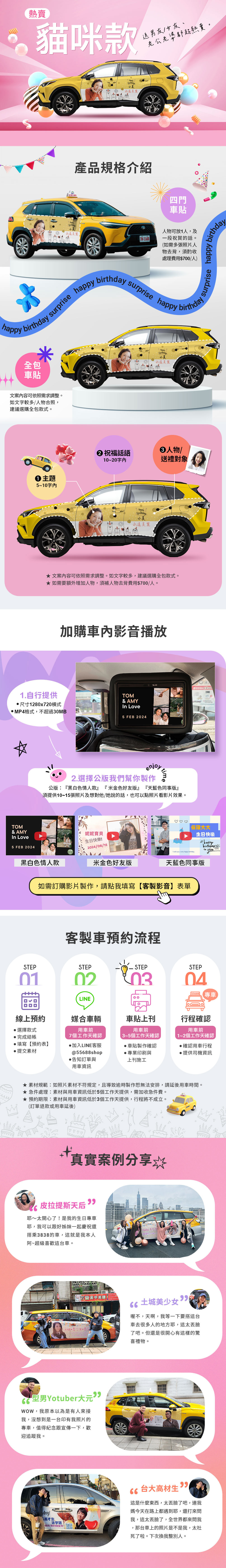 照片收件時間:車貼製作需5個工作天,照片素材需於用車日5個工作天前提供 。若逾時提供,將無法安排印刷+張貼施工,訂單將不成立與退款或延後預約用車時間。