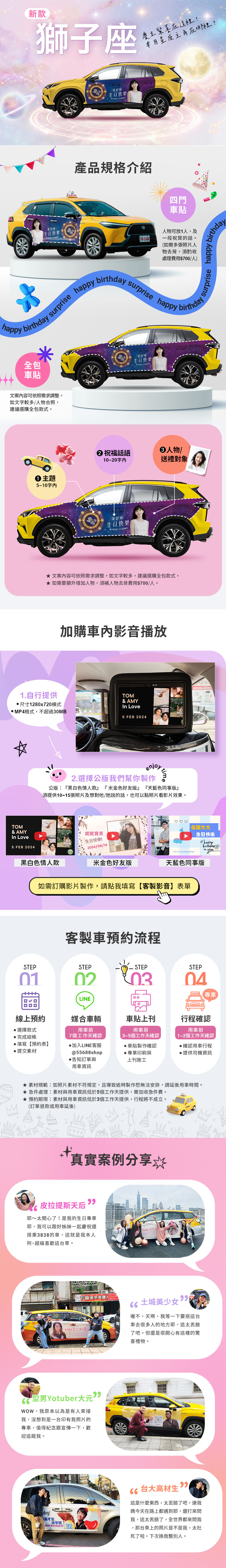 3.公版車貼僅提供1次免費微調文案,不提供試排版或更換照片的服務,請務必上傳正確的照片。