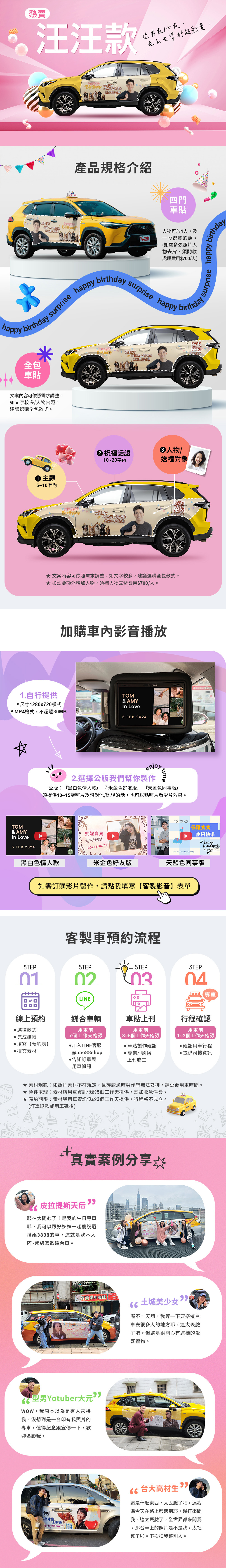 照片收件時間:車貼製作需5個工作天,照片素材需於用車日5個工作天前提供 。若逾時提供,將無法安排印刷+張貼施工,訂單將不成立與退款或延後預約用車時間。