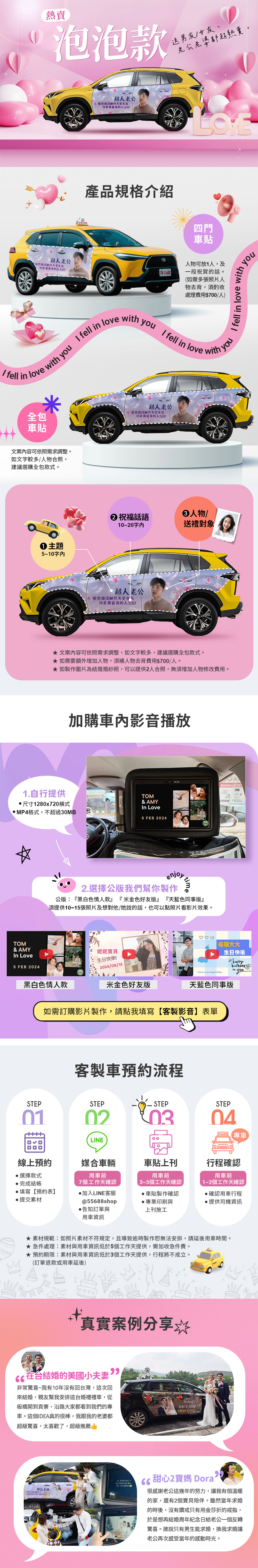 照片收件時間:車貼製作需5個工作天,照片素材需於用車日5個工作天前提供 。若逾時提供,將無法安排印刷+張貼施工,訂單將不成立與退款或延後預約用車時間。