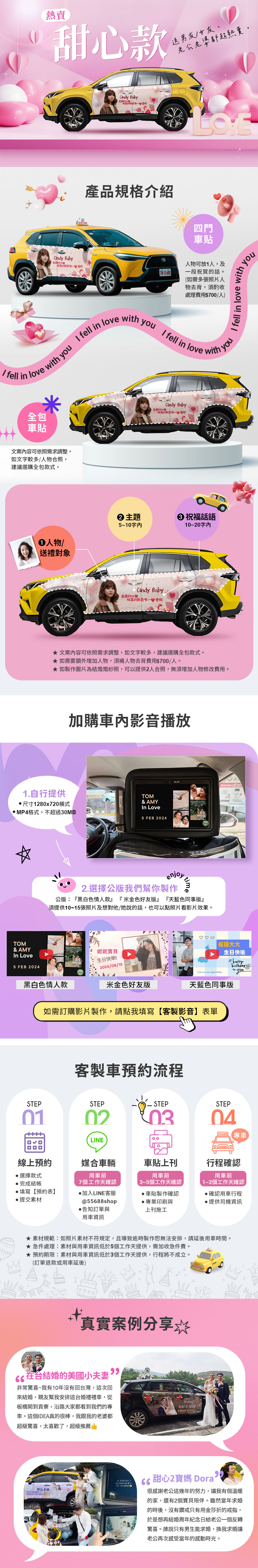 照片收件時間:車貼製作需5個工作天,照片素材需於用車日5個工作天前提供 。若逾時提供,將無法安排印刷+張貼施工,訂單將不成立與退款或延後預約用車時間。