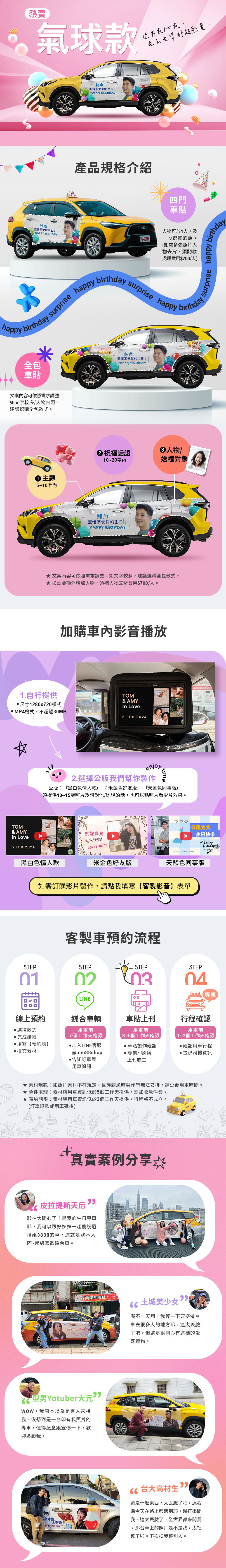 照片收件時間:車貼製作需5個工作天,照片素材需於用車日5個工作天前提供 。若逾時提供,將無法安排印刷+張貼施工,訂單將不成立與退款或延後預約用車時間。