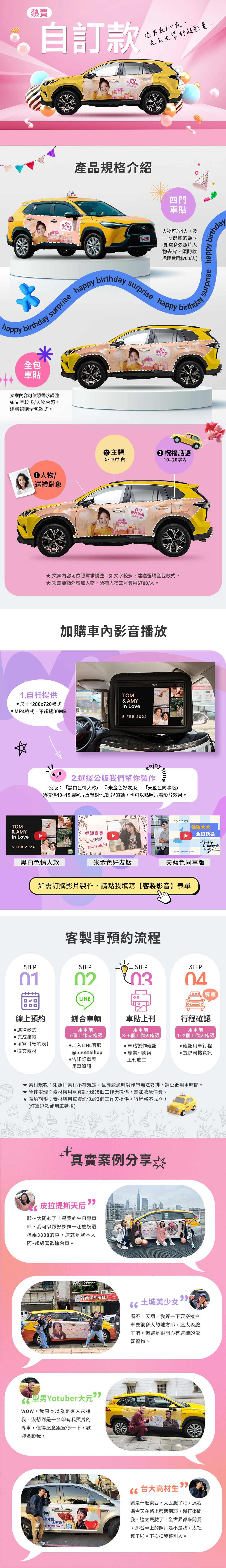 •照片收件時間:車貼製作需5個工作天,照片素材需於用車日5個工作天前提供 。若逾時提供,將無法安排印刷+張貼施工,訂單將不成立與退款或延後預約用車時間。