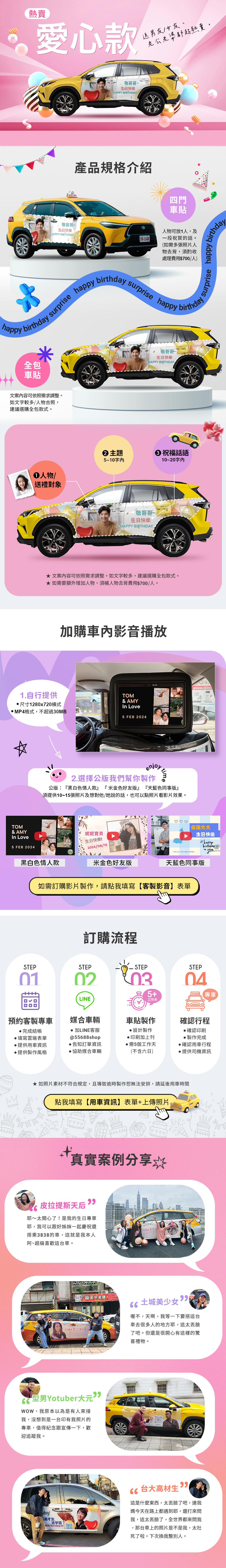 1.車貼製作時間 : 車貼印刷需5個工作天,(不含六日、例假日),照片素材需於結帳後,於用車日5個工作天前提供(交件時間依「專車預約表單」登記為主) 不接受LINE提交請務必注意(照片容易被壓縮)。