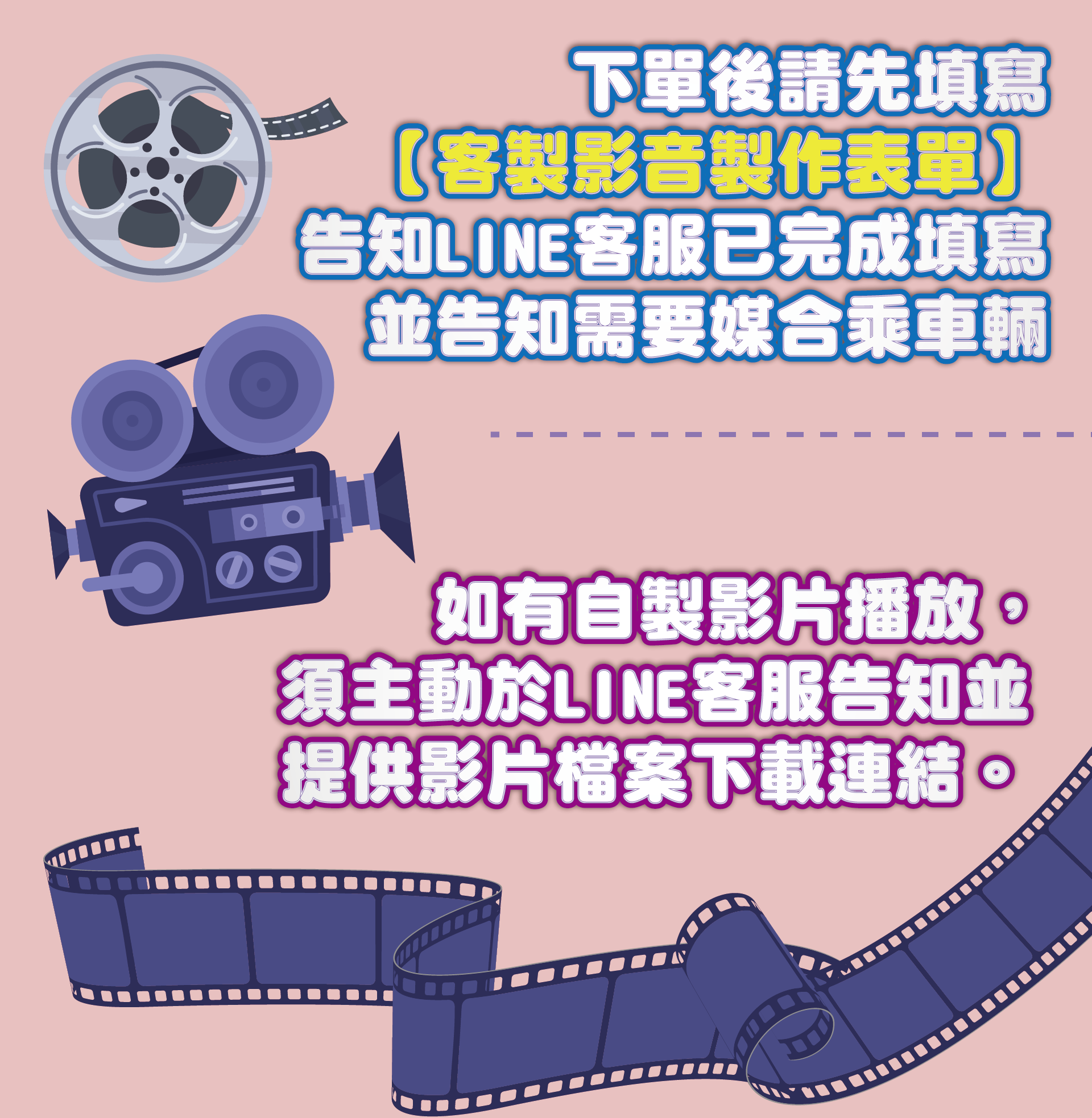 .訂購客製影音流程 : 1. 下單後請填寫> 「 客製祝福影音_預約表 」  2.填寫完預約表後聯繫> 「 55688商城 」LINE客服   3.影片素材請於用車日6個工作日前提供