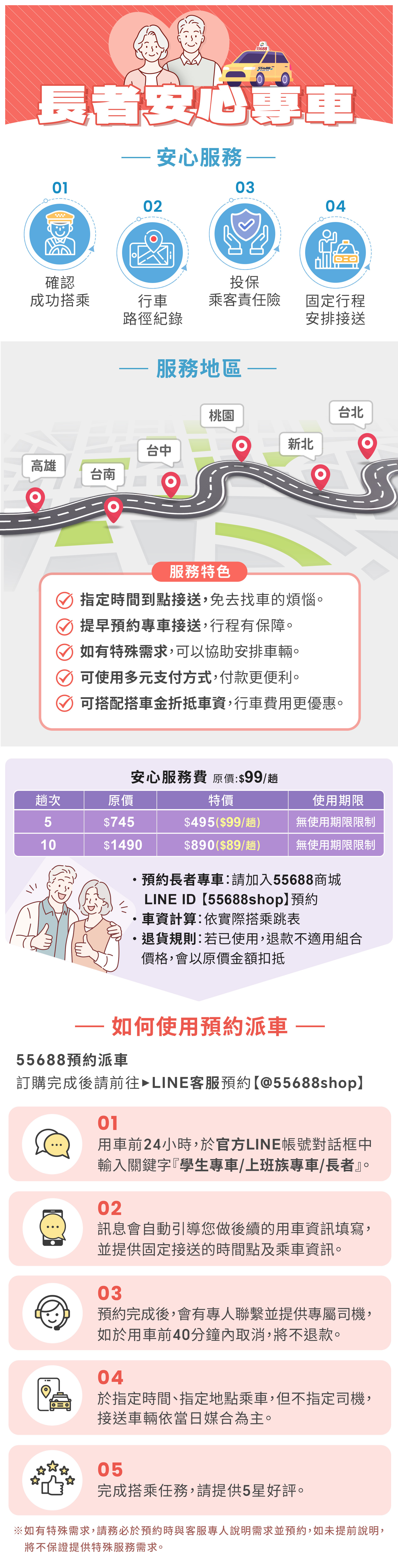 • 保證有車及專人媒合服務限台北市、新北市、桃園市、台中市、台南市、高雄市,其他地區可提供媒合服務但不保證有車。