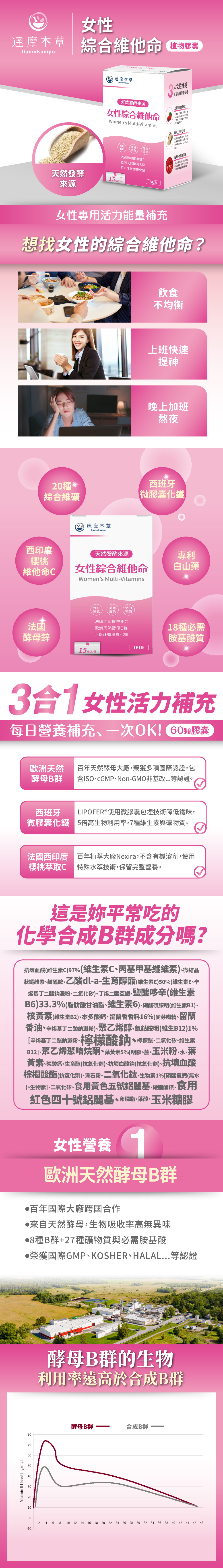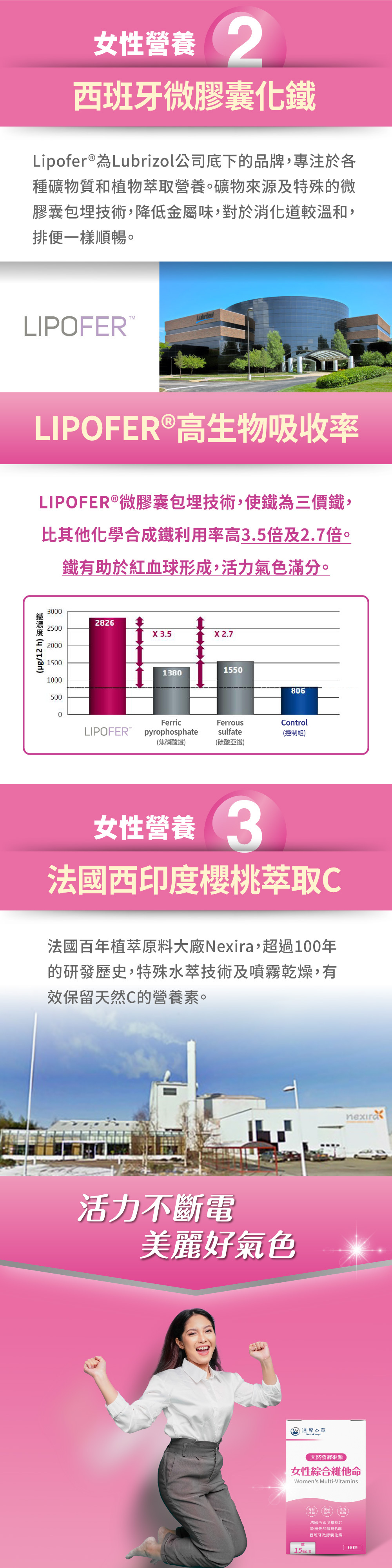 A:使用歐洲天然酵母B群、法國西印度櫻桃萃取維他命C、並添加溫和消化道的Lipofer®微膠囊鐵(三價鐵),補充女性所需維生素及礦物質,幫助精神旺盛,維持好氣色。