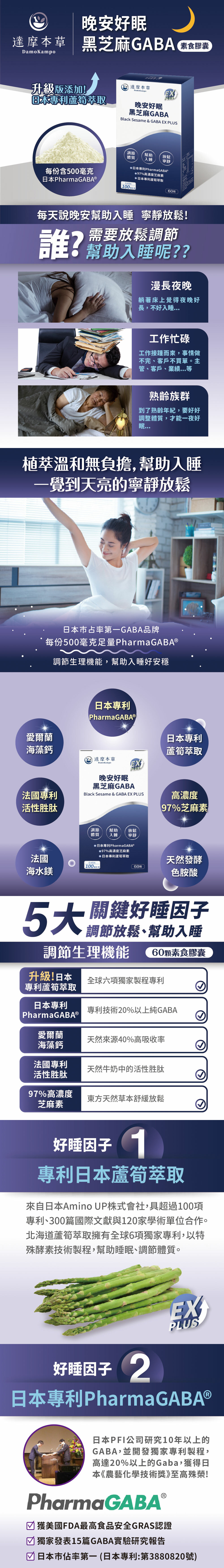 晚安好眠黑芝麻GABA,不添加化學合成,結合東方素材,不含360項西藥,溫和無負擔。搭配日本專利PharmaGABA®,高達20%GABA純度、結合古代食材東方睡果-酸棗仁、97%高濃度黑芝麻素萃取。並添加法國科學家研究30年的10國專利活性十胜肽,寧靜放鬆,幫助入睡。